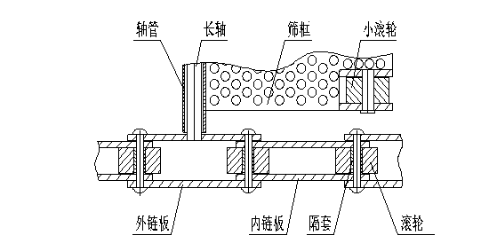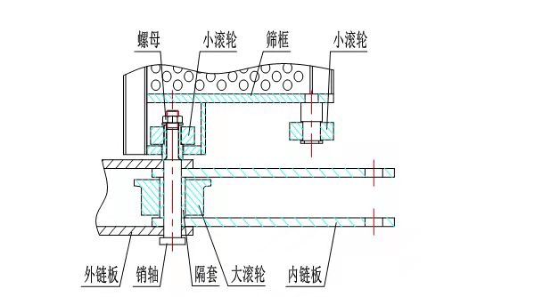 這種烘干機應該屬于輕型烘干機。它的篩板是用單板制作的,沒有立筋做邊框,物料的承載能力會小一些,雖然有的廠家用五毫米厚的鋼板來制作篩板,但是對于垂直板面的壓力來說,抗彎強度是提高不了多少的。他的特點是外鏈板與銷軸和內鏈板與軸套是鉚接連接的,所以他們之間沒有相對運動。他的摩擦副是銷軸與軸套和軸套與大滾輪。銷軸與軸套接觸面大,徑向壓強小,這樣會延長鏈條的使用的壽命。他存在的問題是,由于軸套要與鏈板進行鉚接,為了保證軸套有一定的塑性,軸套熱處理硬度就不能太高; 在運行時,大滾輪與銷軸要做相對運動,軸套硬度提不上來,磨損過快,直接影響鏈條的使用壽命。因為是鉚接鏈接,所以軸套沒法更換,一般情況就是換掉整根鏈條,更換成本大。
